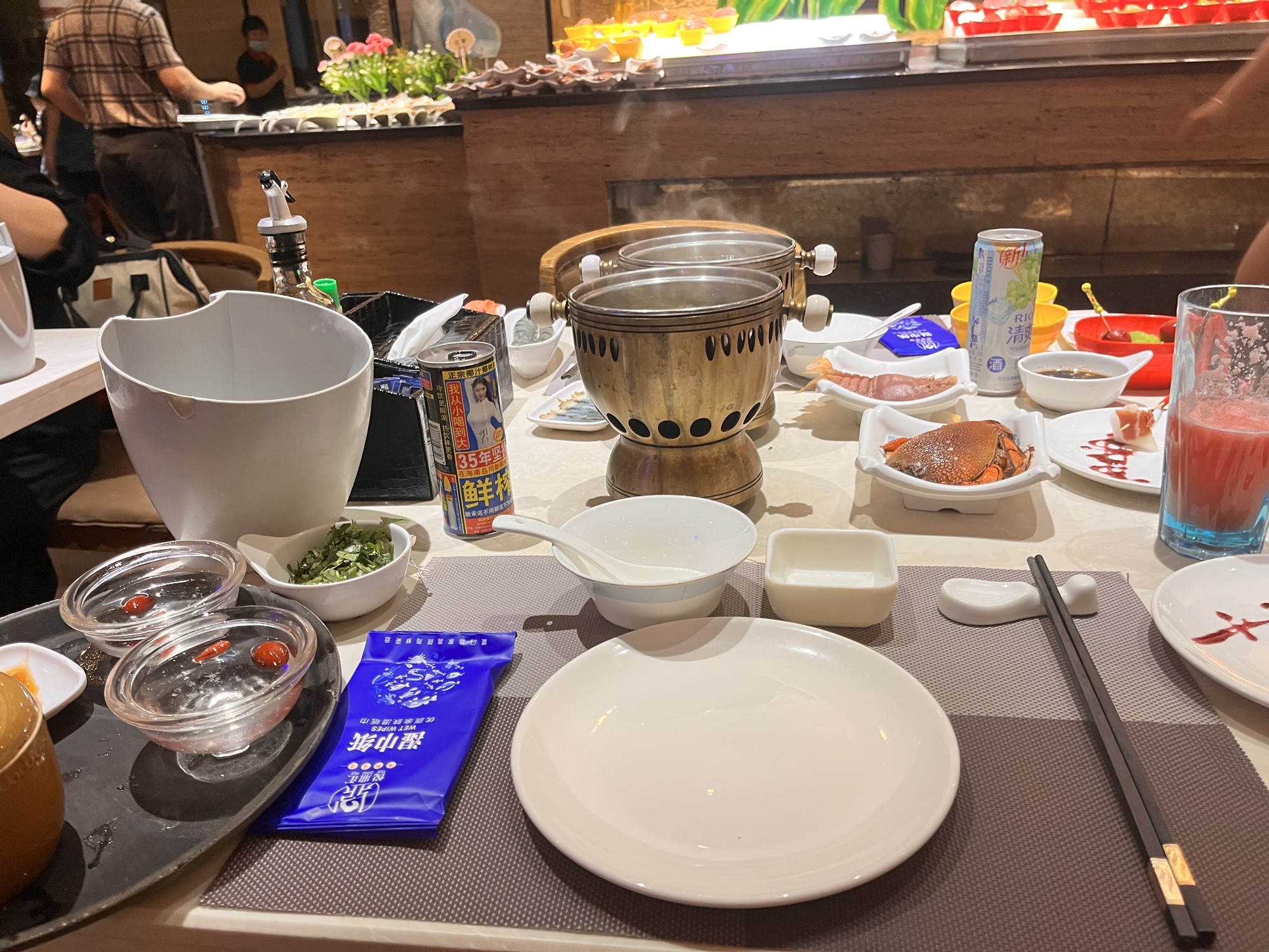 坐标岛内,人很多很多,需要提前预约,地铁直达,大概300左右一位,很多带娃的,好像可以带一个免费小孩,海物基本冻鲜,每人一个小锅仔,东西品种还蛮眼花撩乱的,加蒸汽锅的话要加60,服务态度超好,特别是阿姨,一直换碟子加汤