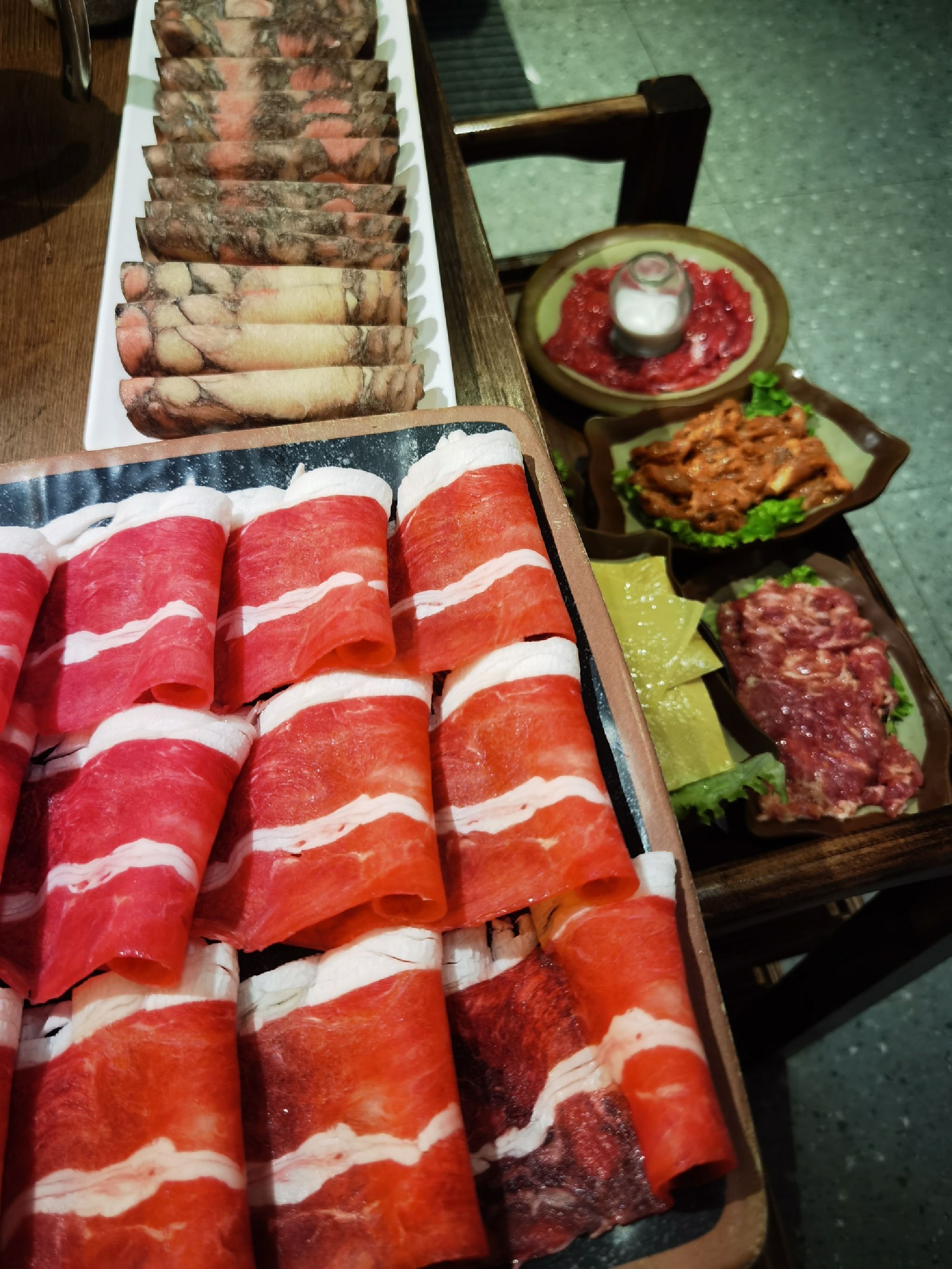 超多肉肉,甜品也是免费的,有好多种! 两人餐三个人吃也绰绰有余! 甜品每段时间都会变化,每样都很好吃!现在还上了些免费鸡翅尖、狼牙土豆等等,很划算~「重九火锅」