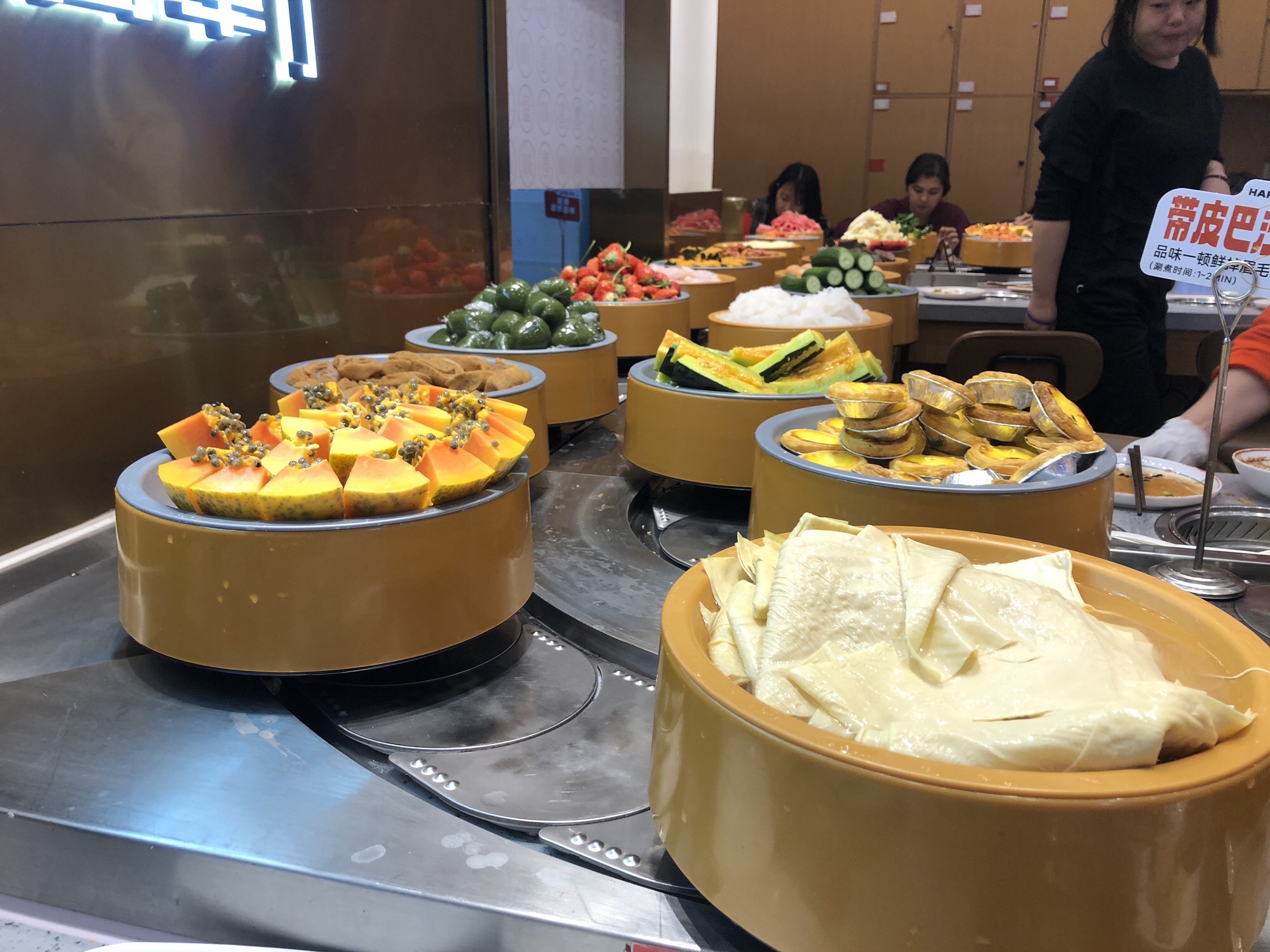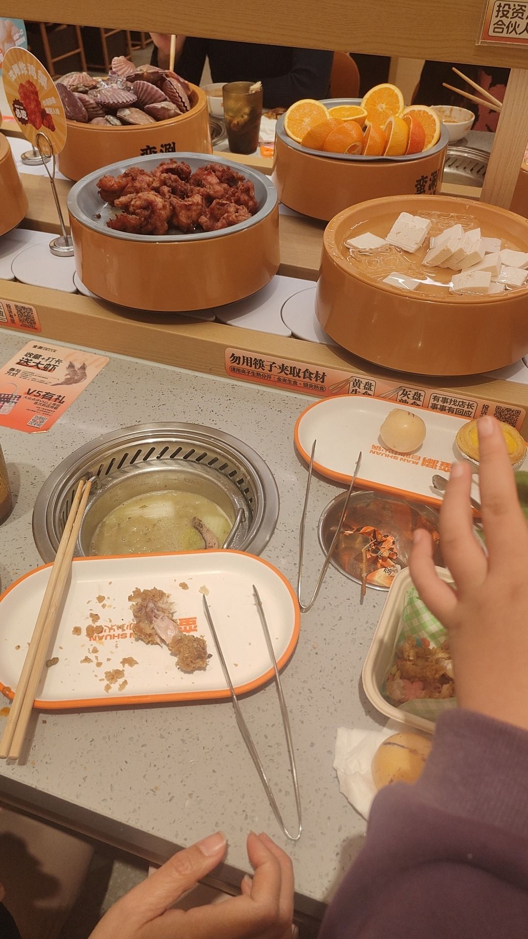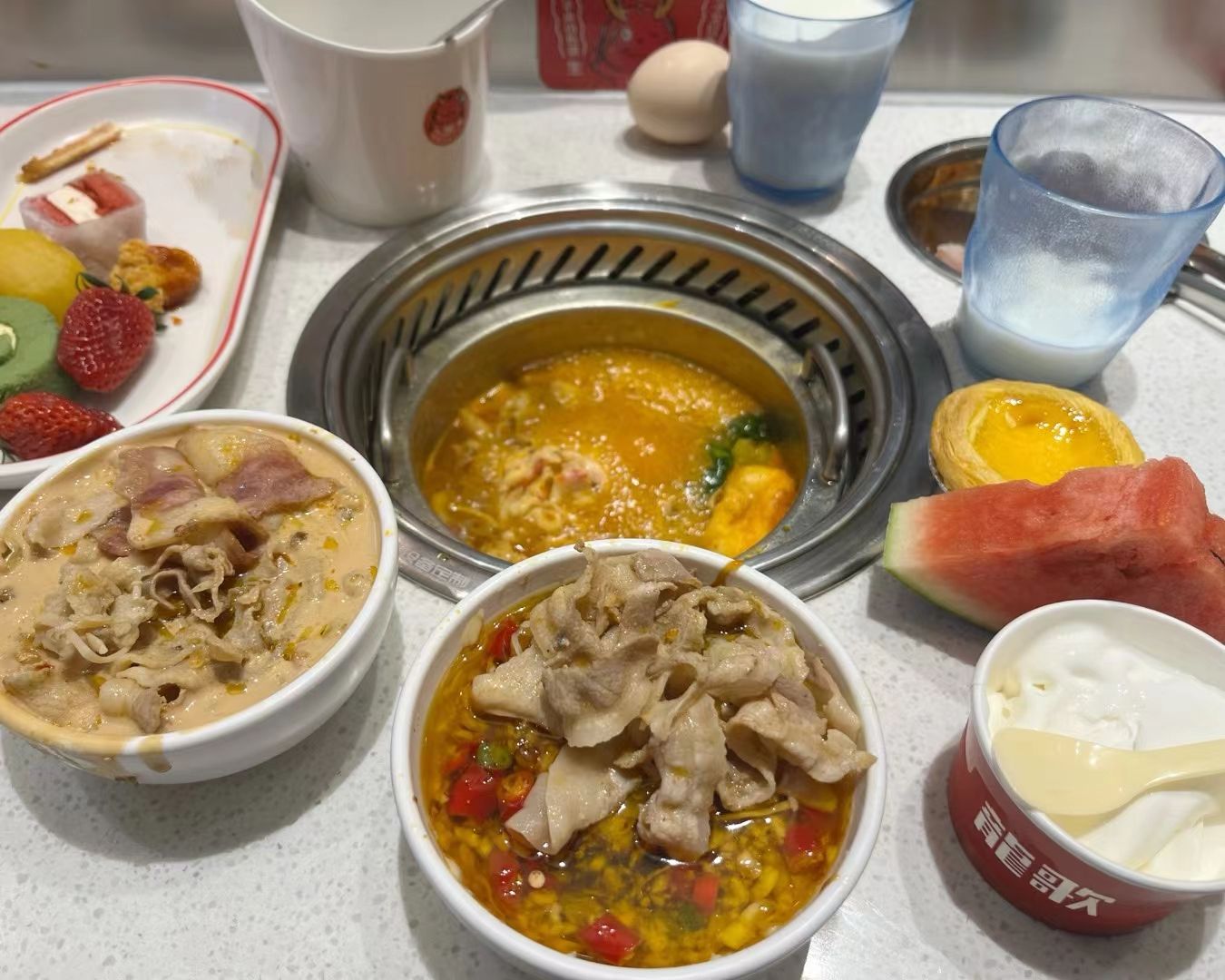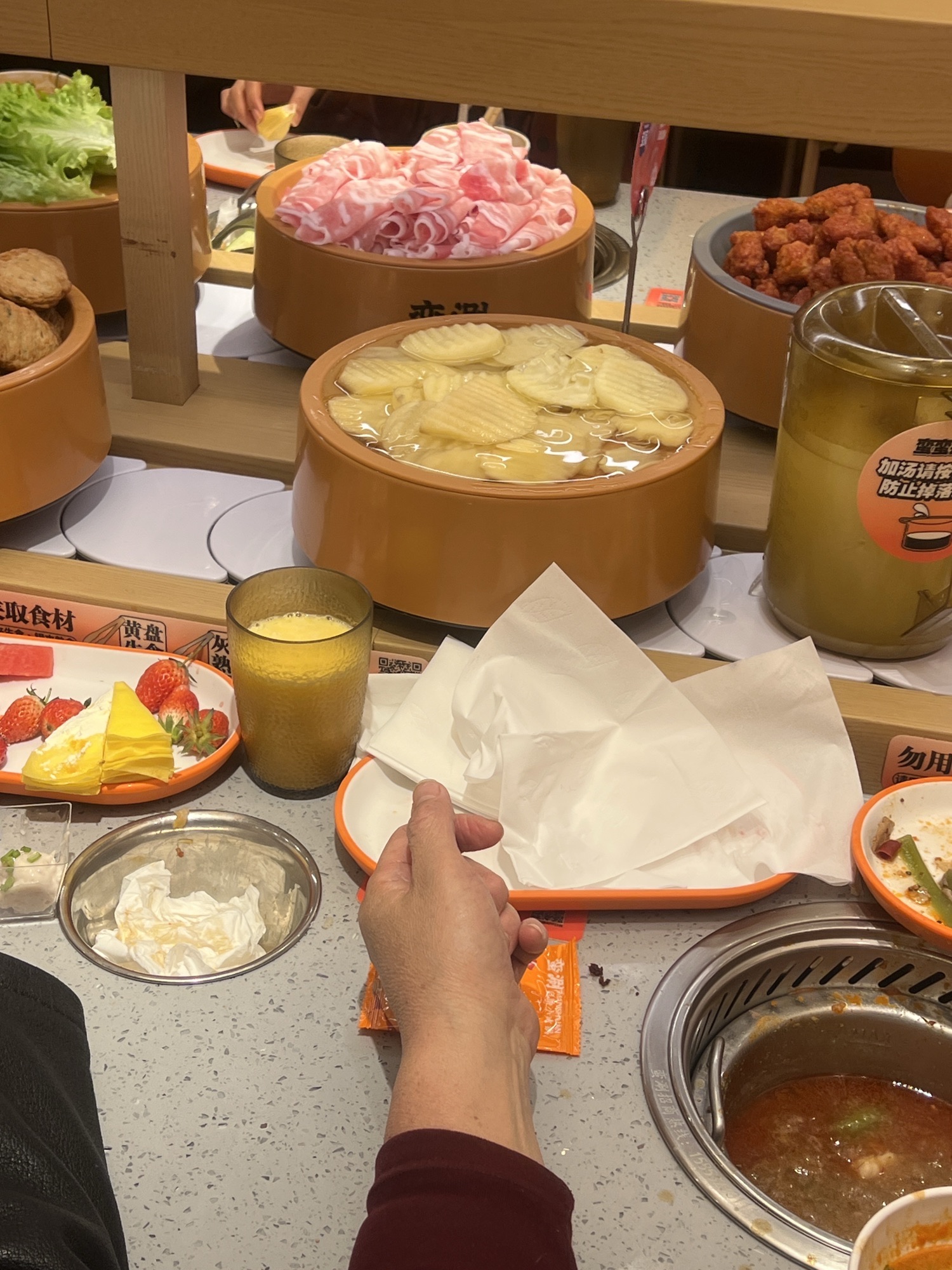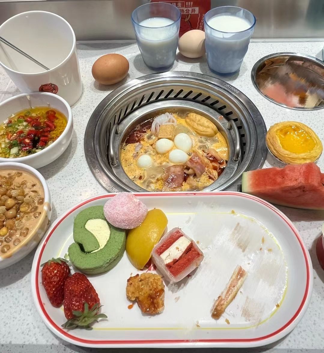 🍴菜品:真的特别特别全,几乎没有办法全部吃遍 光新鲜水果就有7/8种,草莓又大又甜还完全不限量,除此之外的炸货也特别多,感觉不吃火锅光吃小食也能吃饱,涮品也很新鲜,鸭肠、乌鸡卷、龙利鱼都有,特别推荐 🥂环境:新开业的店干干净净,刚开放的时候去没什么人,后面慢慢就变多了 💁服务:小哥给安排在出餐口的位置,拿菜特别方便,阿姨收垃圾也收的很及时,好评好评!