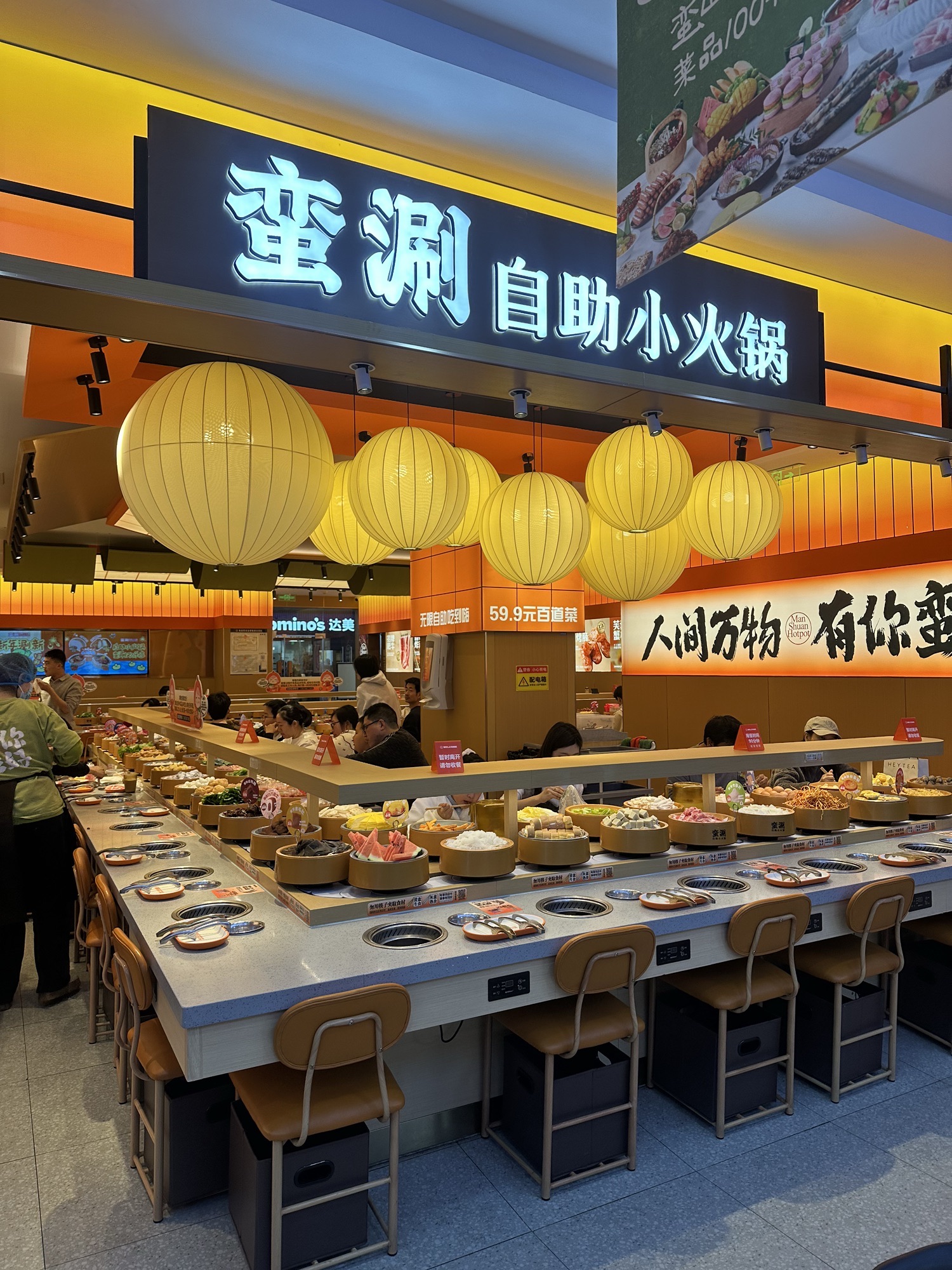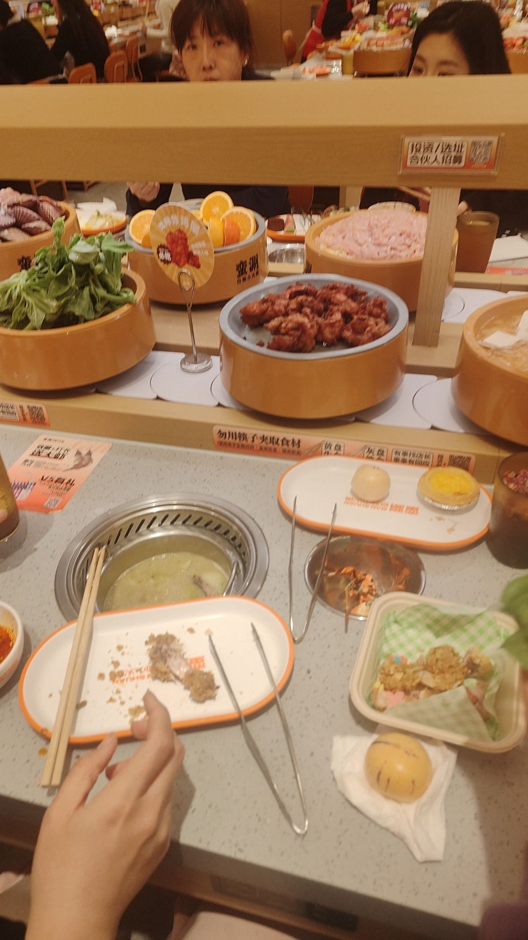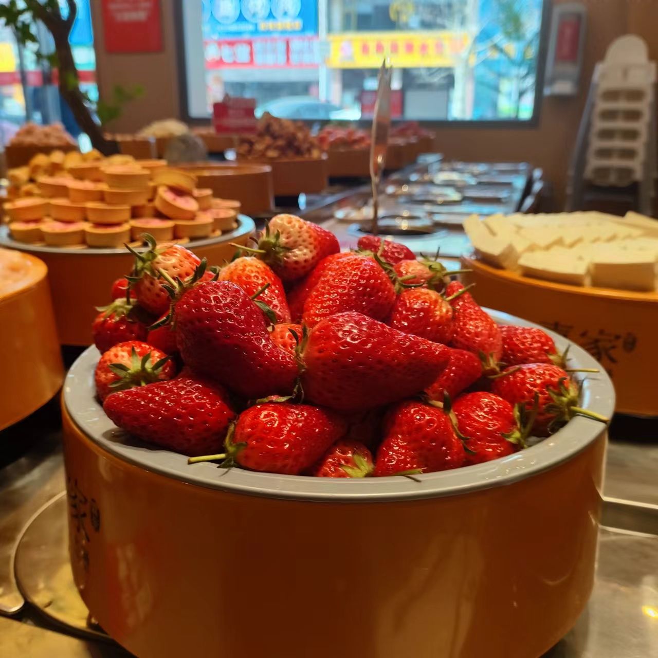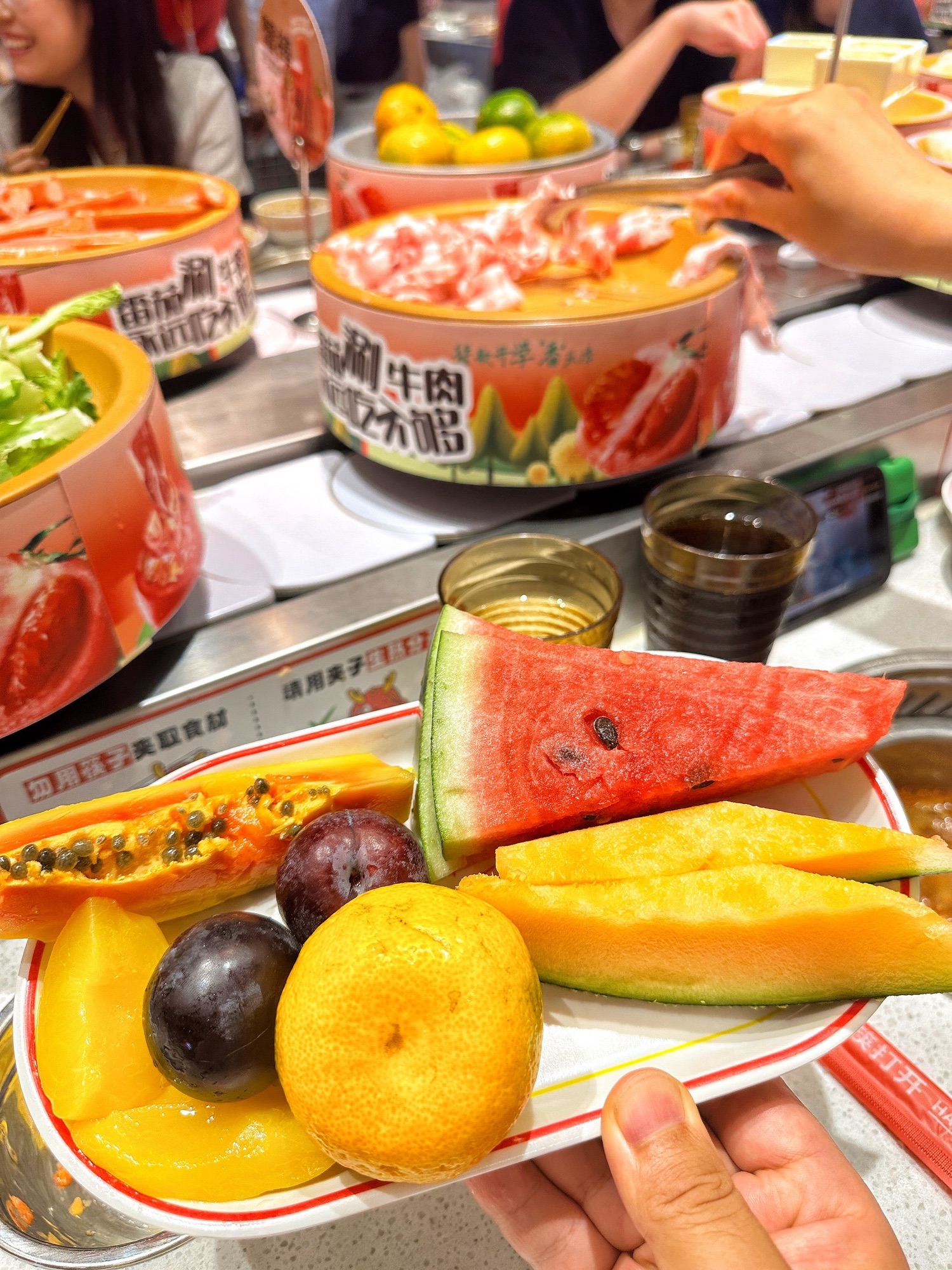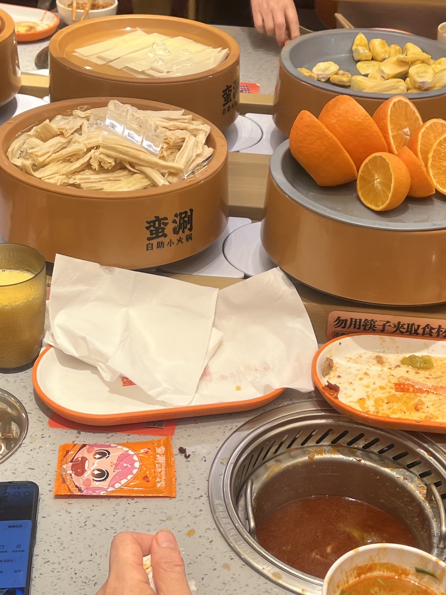 🍴菜品:真的特别特别全,几乎没有办法全部吃遍 光新鲜水果就有7/8种,草莓又大又甜还完全不限量,除此之外的炸货也特别多,感觉不吃火锅光吃小食也能吃饱,涮品也很新鲜,鸭肠、乌鸡卷、龙利鱼都有,特别推荐 🥂环境:新开业的店干干净净,刚开放的时候去没什么人,后面慢慢就变多了 💁服务:小哥给安排在出餐口的位置,拿菜特别方便,阿姨收垃圾也收的很及时,好评好评!
