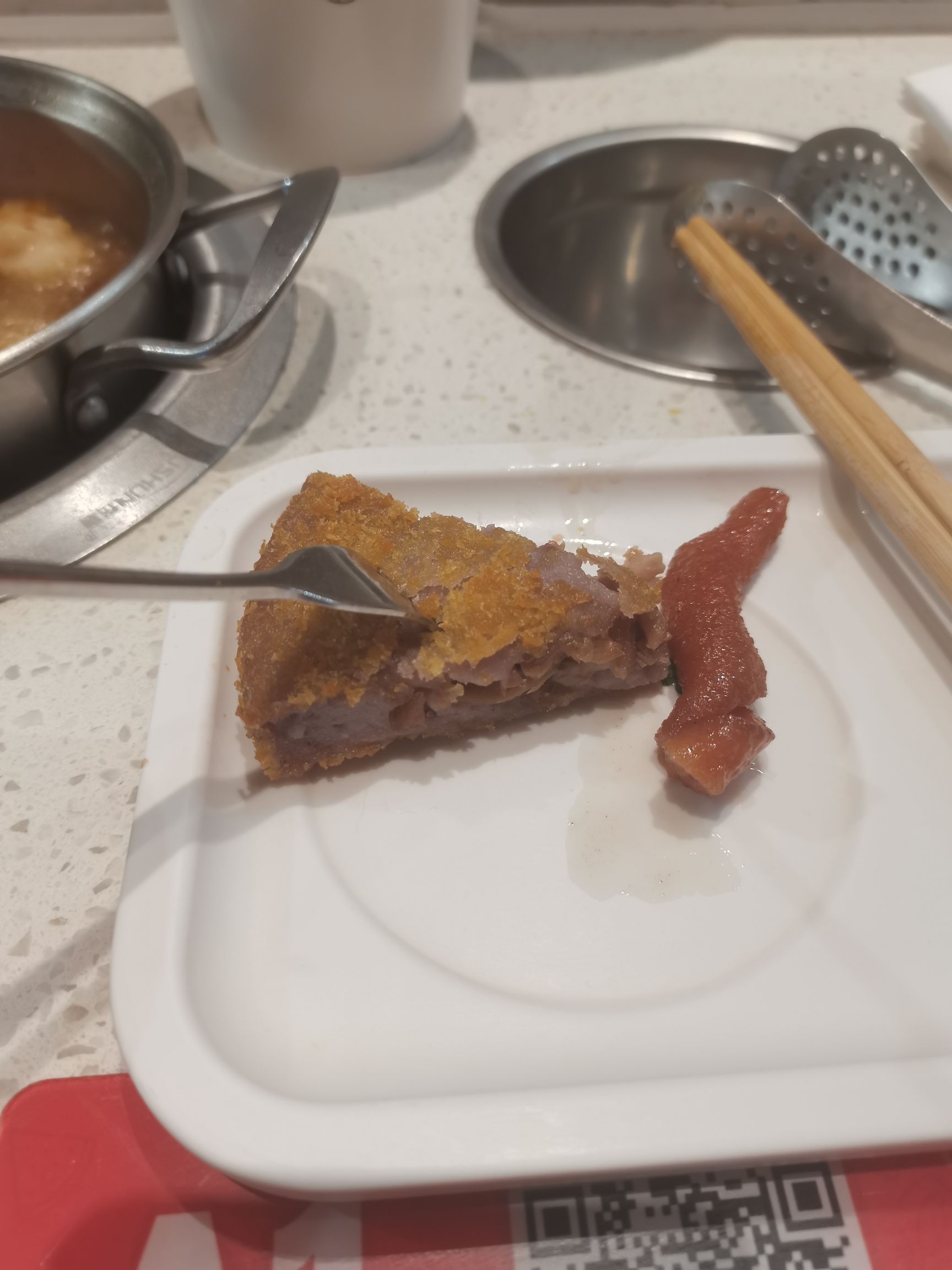 📍位置在金鼎广场的八楼,坐扶梯上来可以直接看到店面,位置很好找。 🍜口味,店内菜品特别多,菜品口味丰富,肉类,蔬菜类,熟食类,丸子类,甜品,水果应有尽有。锅底也有很多种可以选择,比较推荐牛油辣锅。自助区域主要是蘸料和饮料,还有美味的冰激凌🍦。这次很幸运,赶上了龙哥的小汉堡,美味又可爱! 🥂环境很好,就餐位置特别多,餐具都很干净,消毒也很到位。人多的时候可能需要等位。 💁服务很不错,服务员会提供我们装衣服的筐,以免衣服吸附了味道。如果有想吃的没有及时上菜品,还可以和服务员及时反映,添加菜品。 总之是相当不错的小火锅选择!