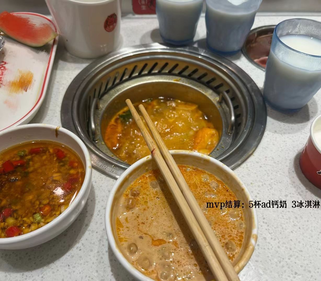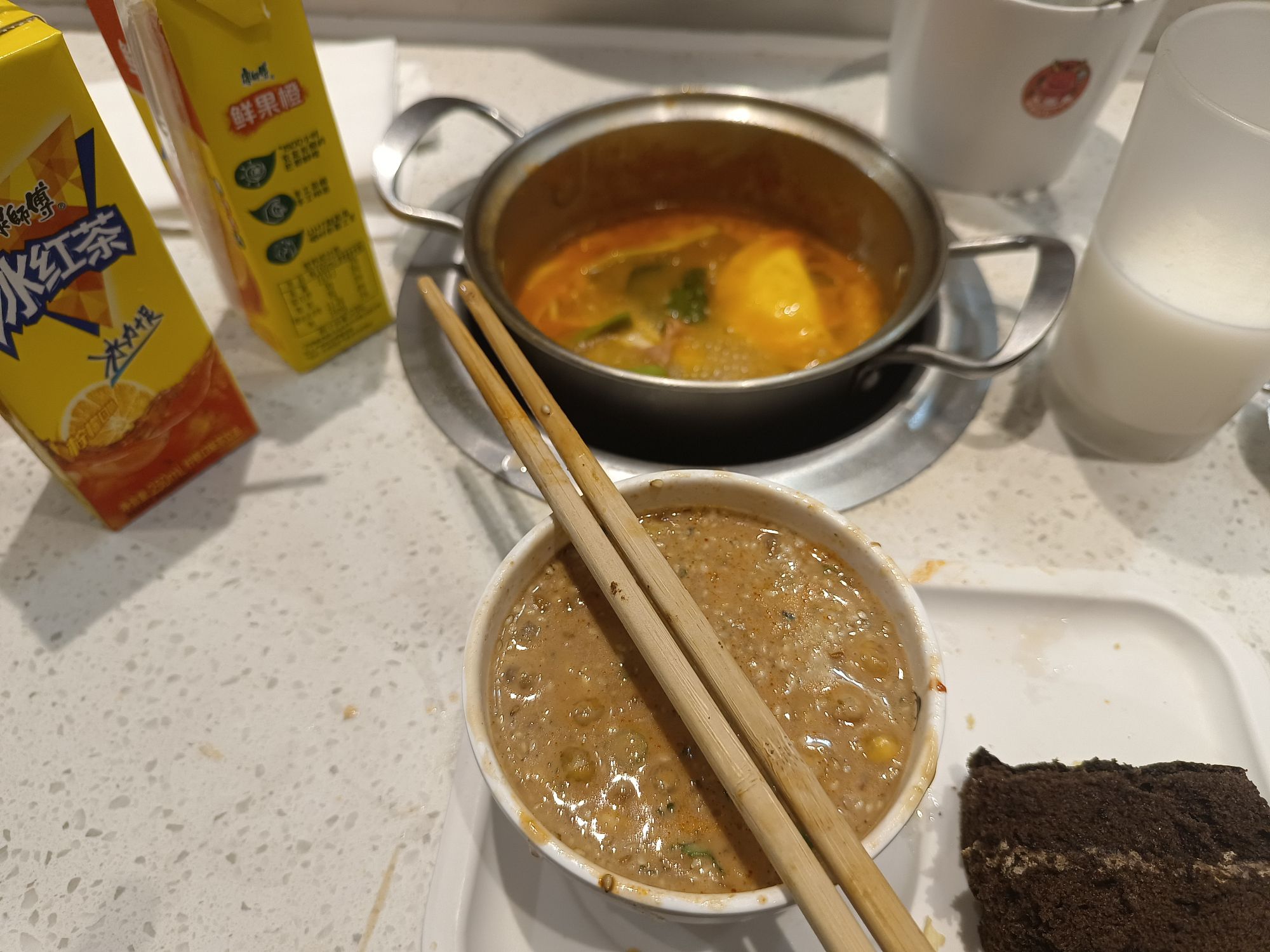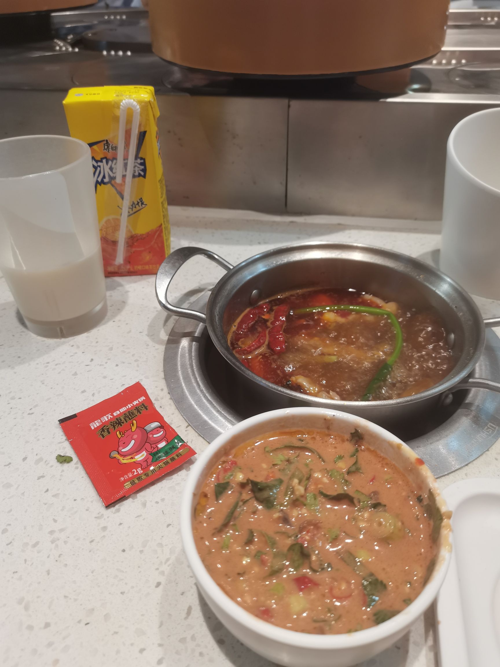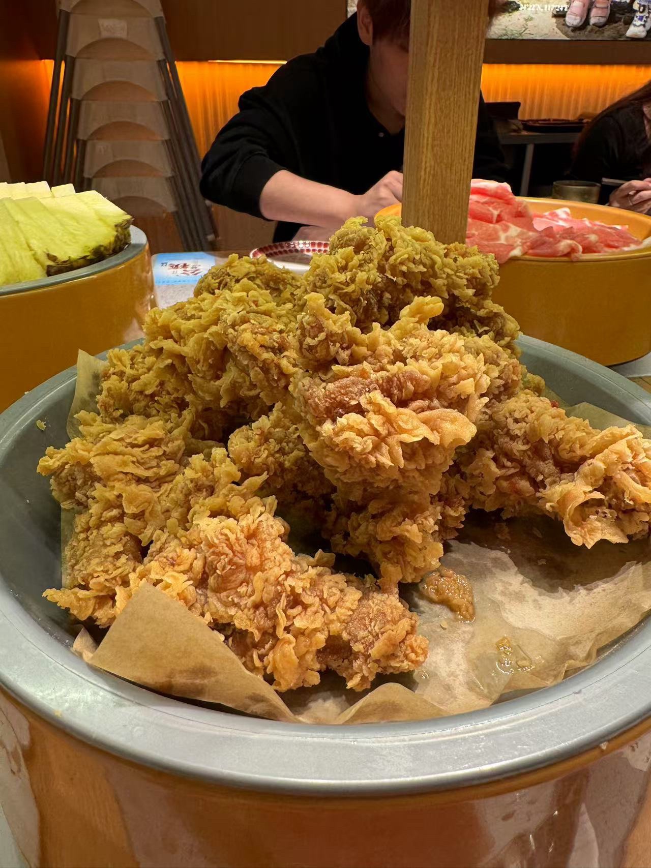 ①炸鸡 必冲 是真滴很好很好吃 外皮很酥脆 里面的肉汁水很足 不用蘸酱就很好吃的那种 ②椒麻鸡翅尖 哇塞塞 这个椒麻味简直太正了 就是吃了立马上头的那一种狂炫一盘子 ③酸奶 奶味很浓郁 俺喝了好几碗 这个是放在冰箱里的 ④肉肉 俺也不知道是啥肉 但狂吃就对了 超级无敌香 ⑤鸡胗 鸡胗也真滴很爱 煮出来脆脆的 好吃 总结:性价比超高炸食基本都不踩雷肉的品种虽然不多但是不限量呀哈哈哈哈,最喜欢番茄锅底!! 综合指数⭐⭐⭐⭐