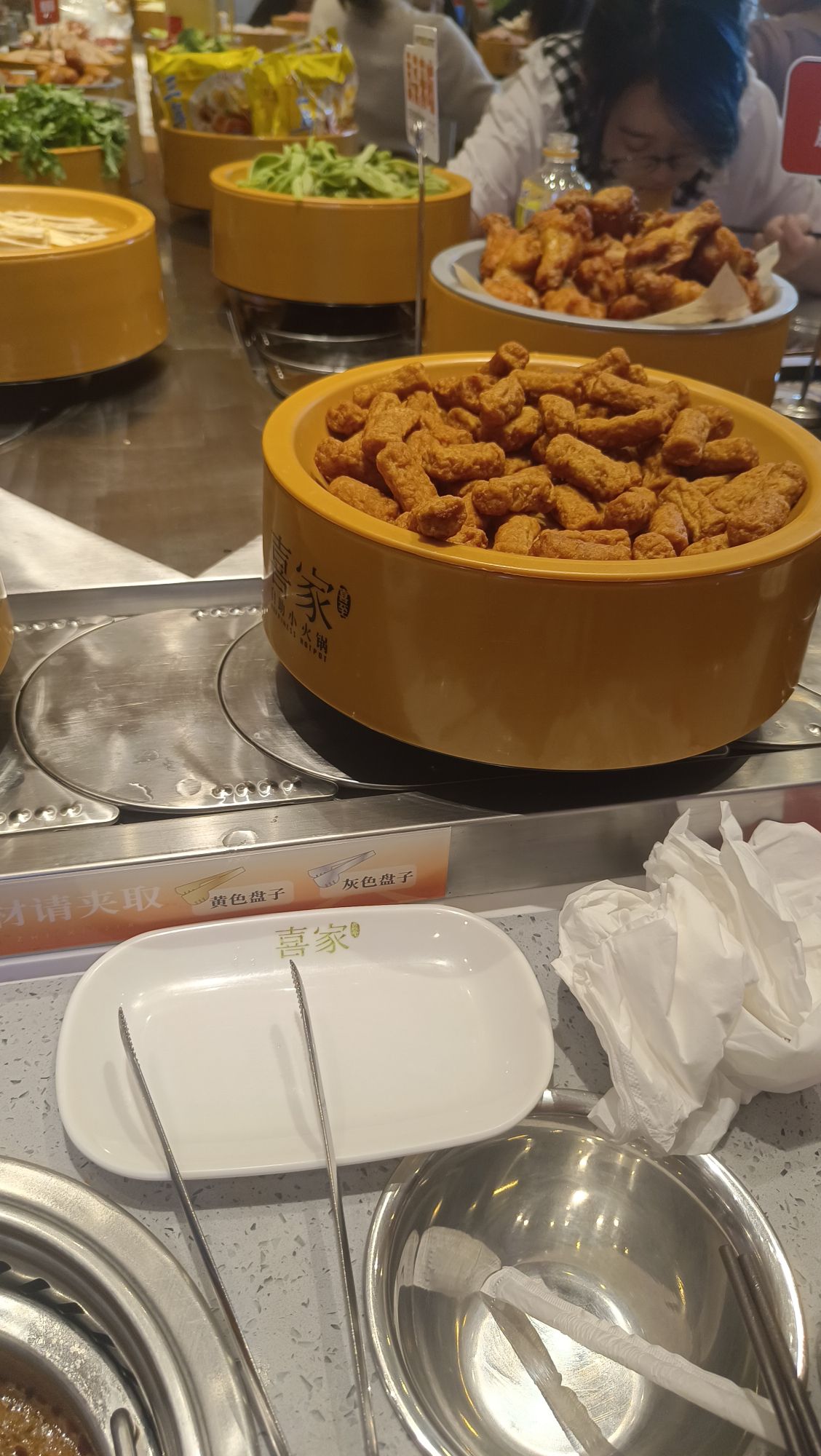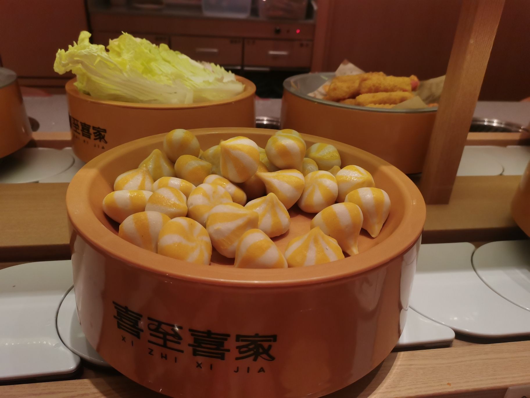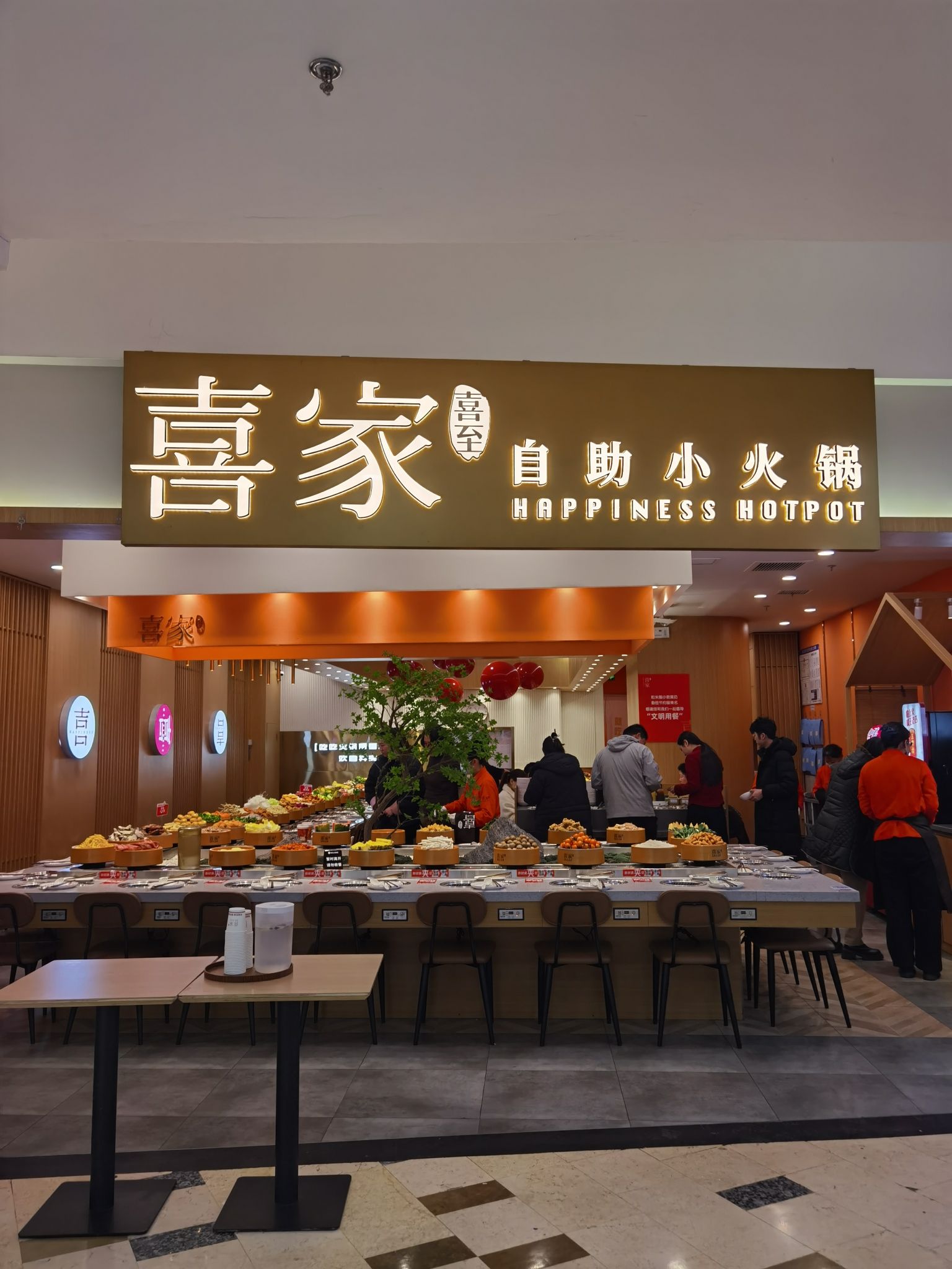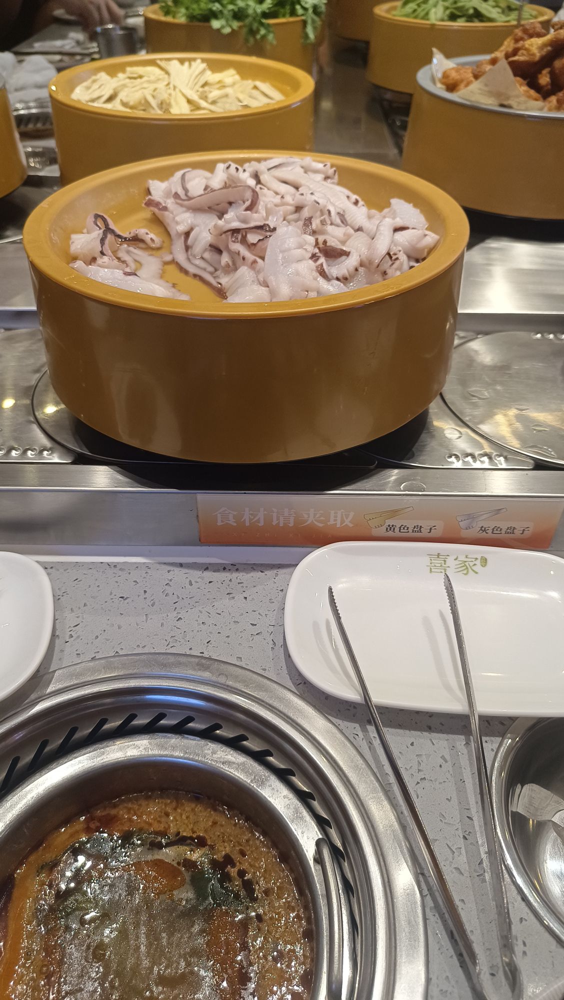 📍位置 在悦喜客来商场里边,中山路天主教堂对面,坐电梯上去,应该是新开业的 🥂环境 晚上去的,里边人也不少,两排转转火锅,座位还有,环境还可以,挺干净整洁的 💁服务 就餐期间有什么没有的餐品,都可以跟服务生提出,很快就能有啦,服务非常不错,垃圾也会及时收走。 🍜口味 要的是番茄🍅锅底,架子上有水可以随时自己添加,还有火鸡面😄,最喜欢吃的是沈阳鸡架超级香,还有奥尔良小鸡腿,热热的,肉特别嫩,各种丸子应有尽有,还有鱼饼,涮菜,都好好吃,还有大泡芙,里边的奶油是动物奶油,很大一个,饮料区也有咖啡☕和热饮,冰淇淋🍦也好吃,夹食物的夹子有两个,可以分生熟,抽屉里很贴心还有围裙和卫生纸,非常nice!推荐! 「喜至喜家自助小火锅」