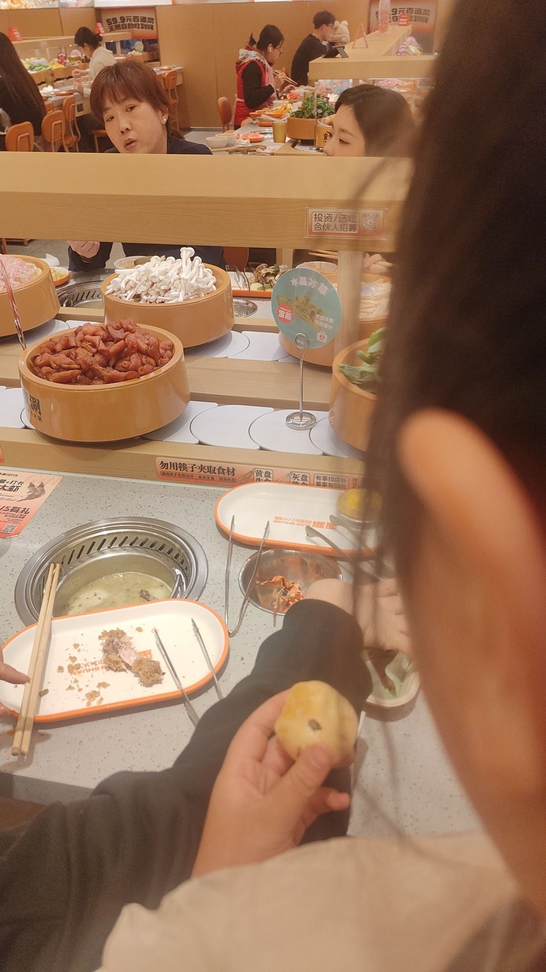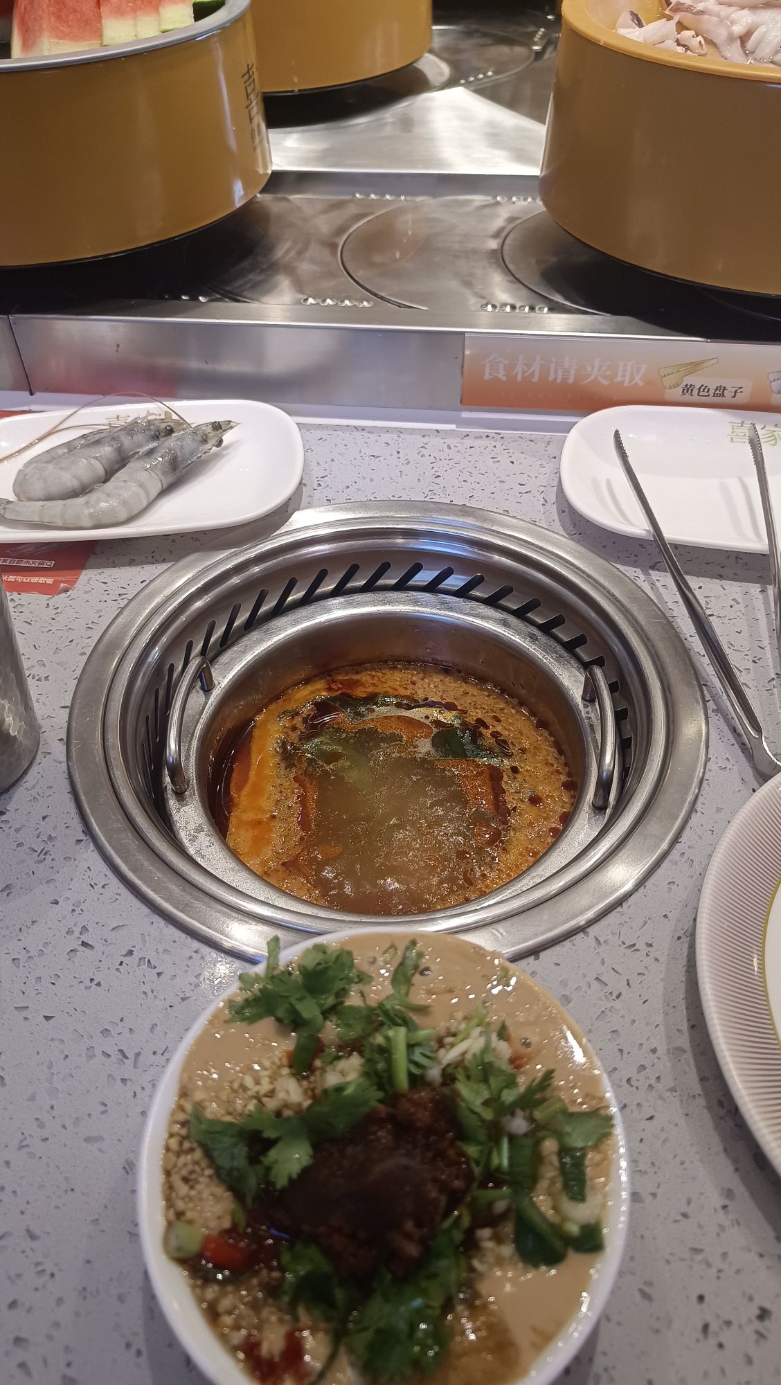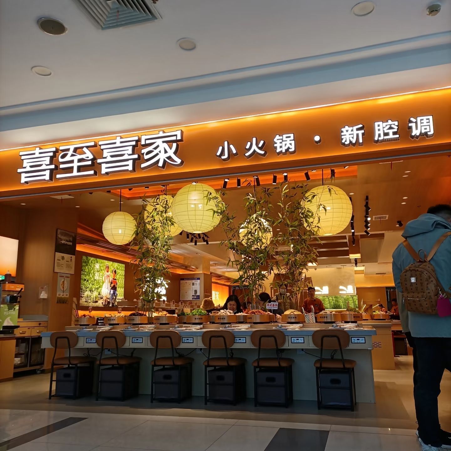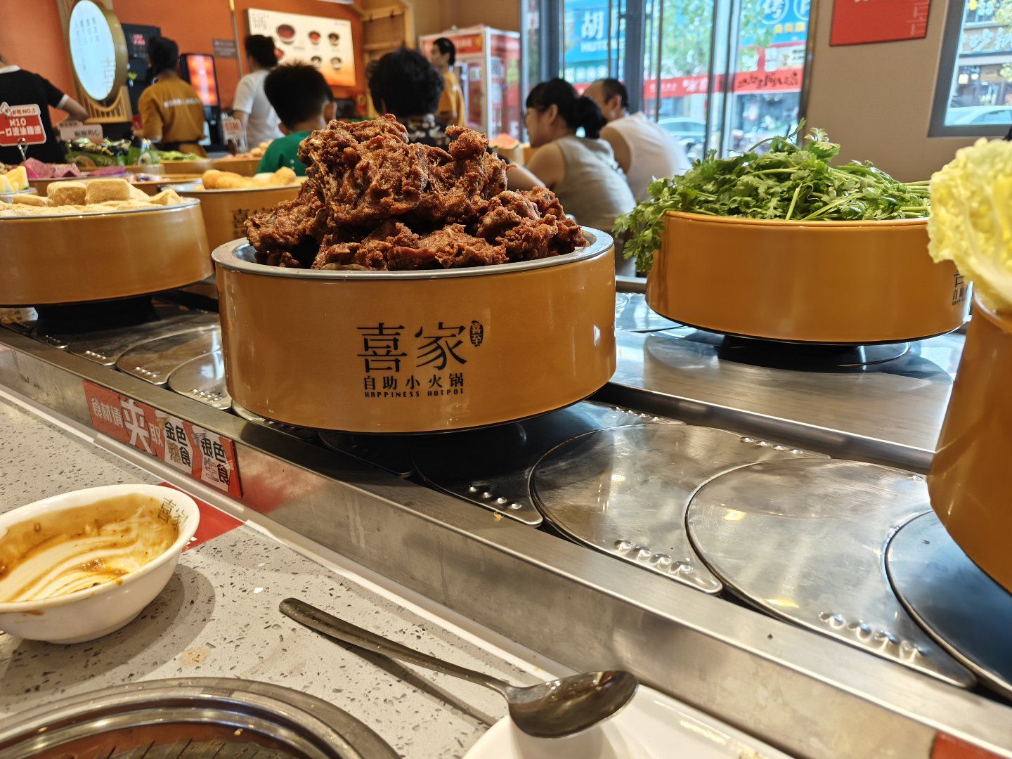 📍位置 在悦喜客来商场里边,中山路天主教堂对面,坐电梯上去,应该是新开业的 🥂环境 晚上去的,里边人也不少,两排转转火锅,座位还有,环境还可以,挺干净整洁的 💁服务 就餐期间有什么没有的餐品,都可以跟服务生提出,很快就能有啦,服务非常不错,垃圾也会及时收走。 🍜口味 要的是番茄🍅锅底,架子上有水可以随时自己添加,还有火鸡面😄,最喜欢吃的是沈阳鸡架超级香,还有奥尔良小鸡腿,热热的,肉特别嫩,各种丸子应有尽有,还有鱼饼,涮菜,都好好吃,还有大泡芙,里边的奶油是动物奶油,很大一个,饮料区也有咖啡☕和热饮,冰淇淋🍦也好吃,夹食物的夹子有两个,可以分生熟,抽屉里很贴心还有围裙和卫生纸,非常nice!推荐! 「喜至喜家自助小火锅」
