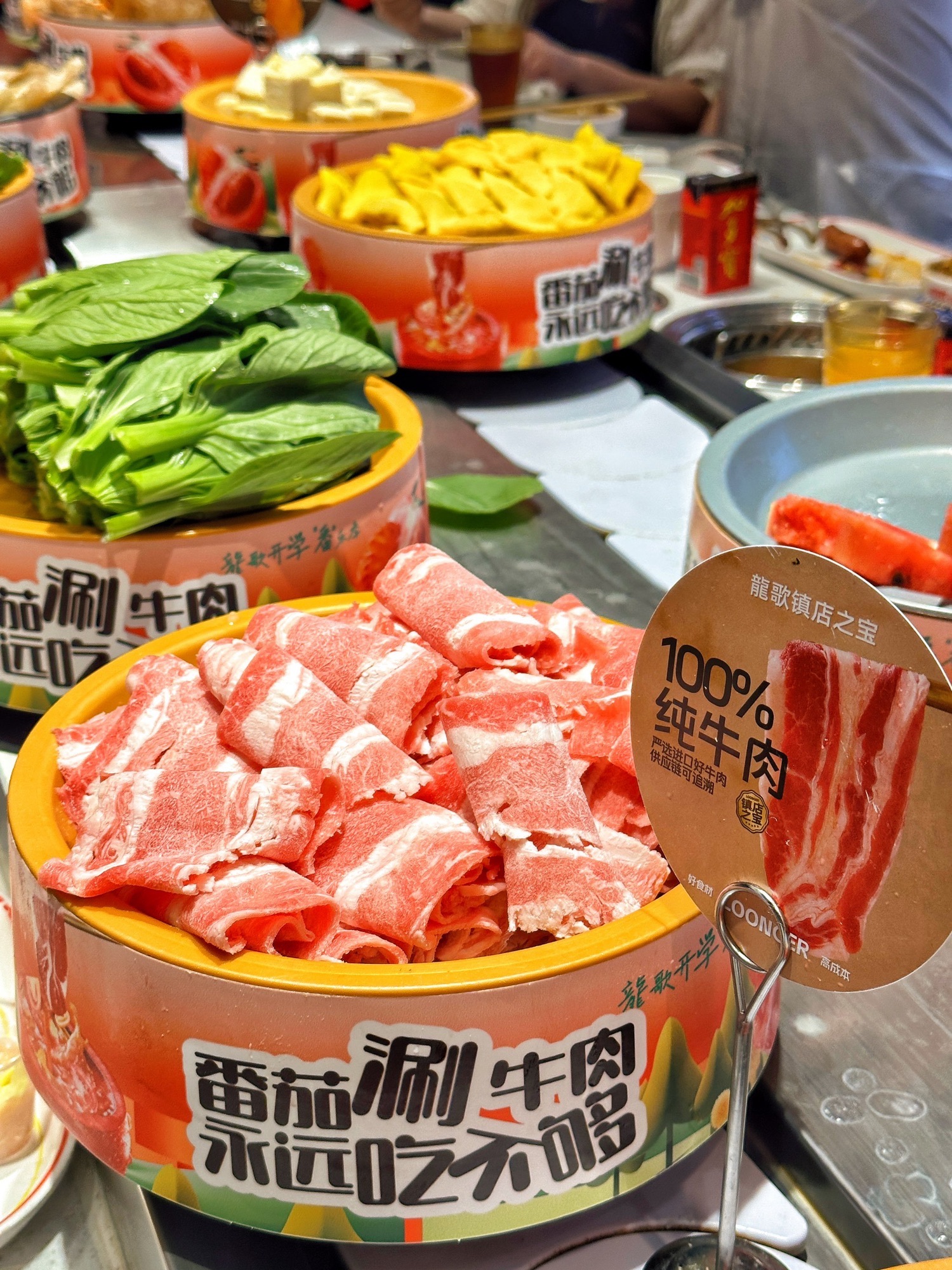 共5条黄牛肉:属于必吃项吧 没吃等于没来过 自助野菜:有些野菜都没有在火锅里吃过 嫩嫩的加酸汤直接把我香死 玉米粑粑:甜口食品爱好者 纯粹喜欢白糖粒的口感 本身其实蛮普通